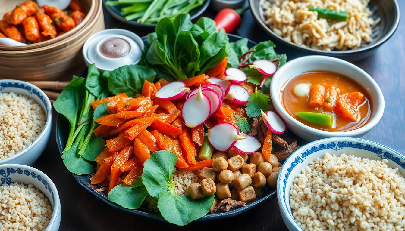 Kimchi stands out for its high probiotic content, promoting gut health. Fresh vegetables, such as spinach and radishes, deliver essential vitamins and minerals. Whole grains like brown rice and barley not only add fiber but also provide sustained energy. Legumes, including mung beans and soybeans, contribute plant-based protein and antioxidants. Gochujang, a fermented chili paste, contains health-boosting properties along with a unique flavor. Finally, sesame oil offers healthy fats and can enhance heart health.